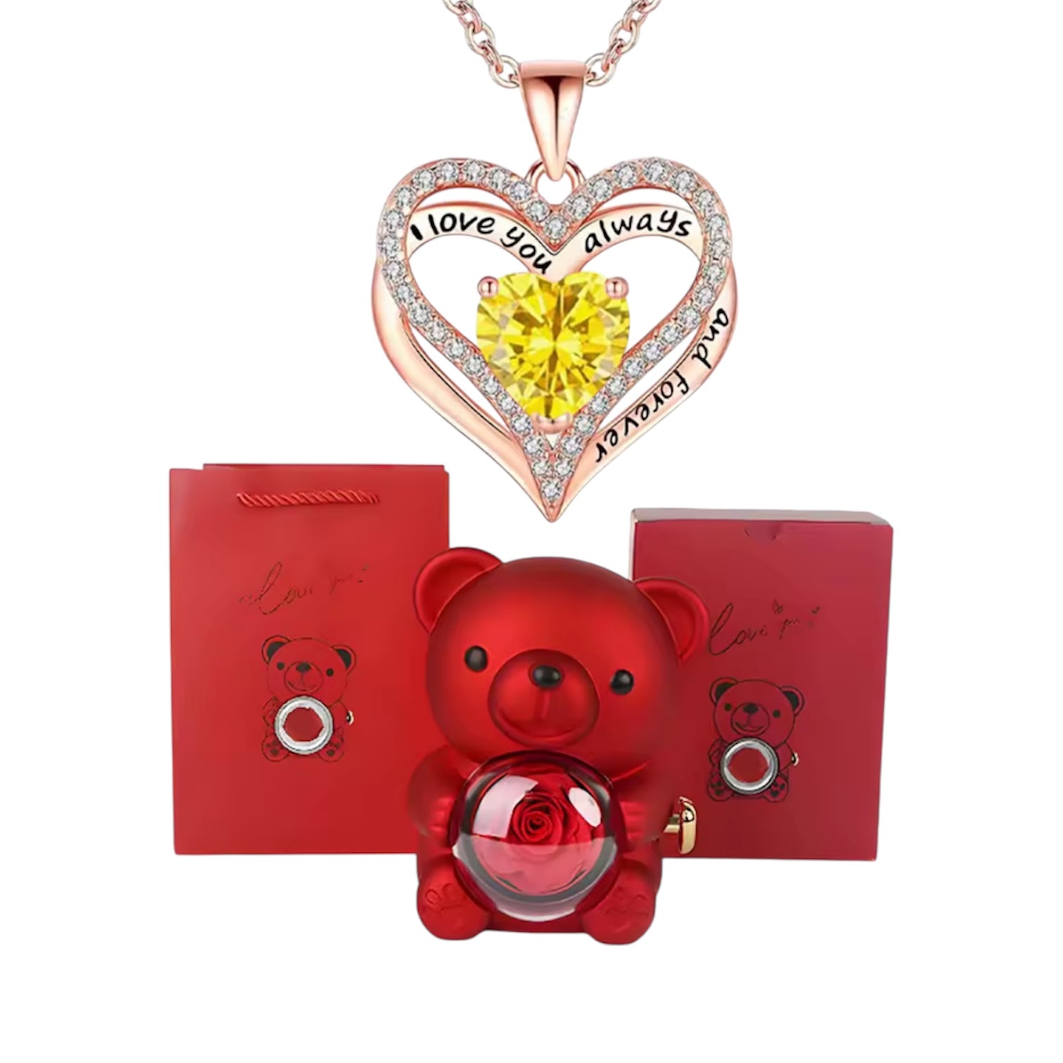 Verras haar met deze prachtige romantische cadeauset: een elegante hartketting gecombineerd met een schattige teddybeer die een roos bewaart in een glazen bol.